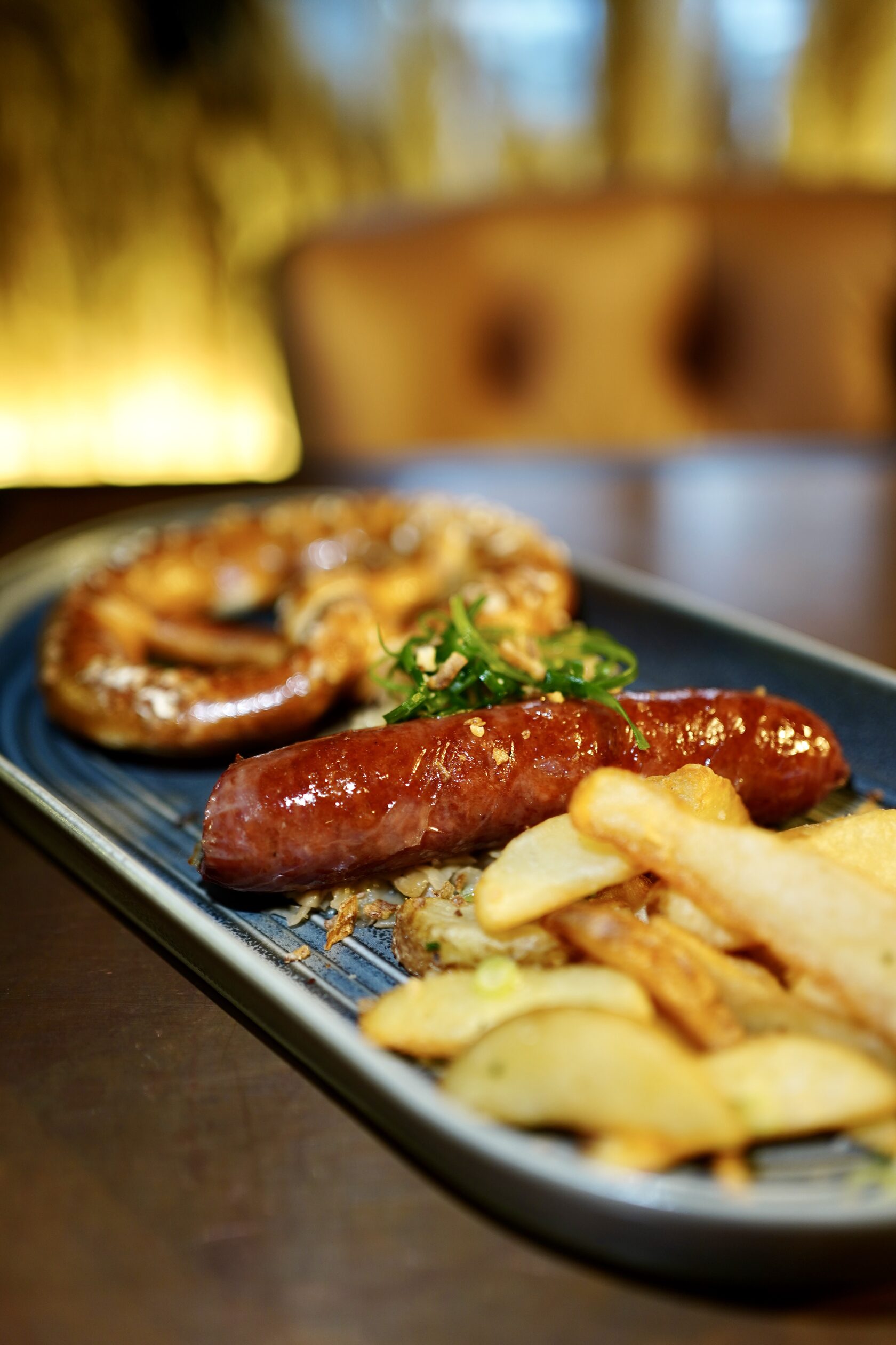 Колбаска говяжья на выбор: классическая / мексиканская с чоризо/ со сливой. Подается с тушеной капустой,картофельными дольками и берцелем. (360гр.)