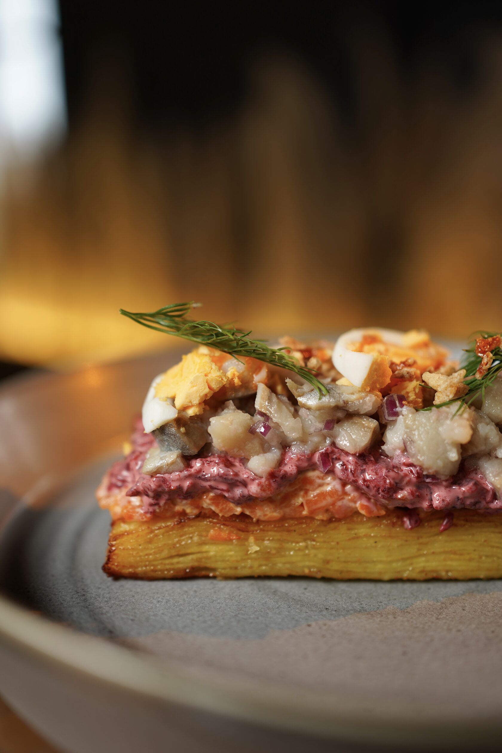Классическая сельдь под шубой в нашем исполнении на картофельном гратене. (250гр.)